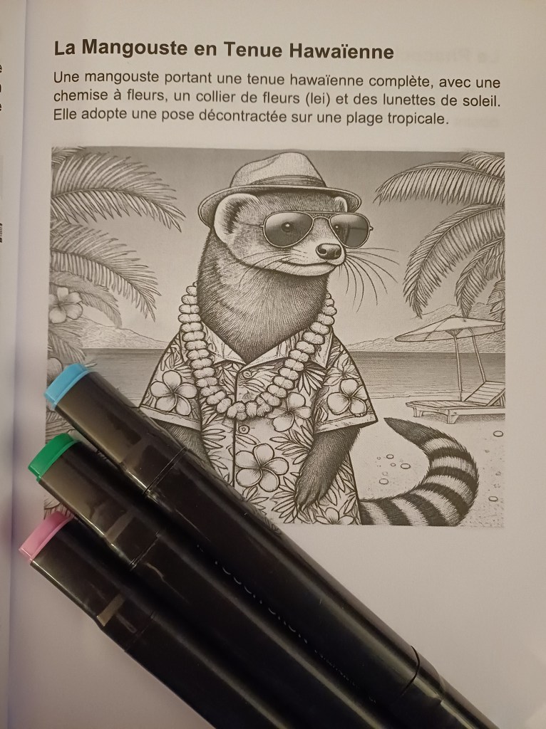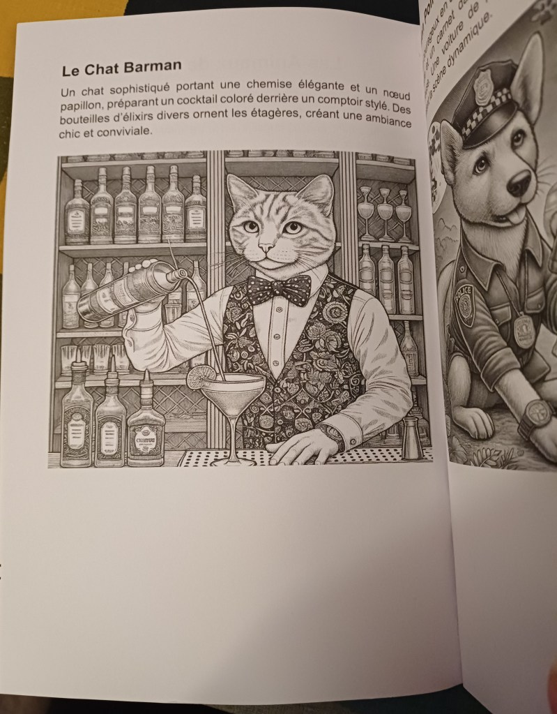 Les idées d’illustrations constituent pourtant l’un des rares points positifs du livre. Les animaux anthropomorphes (loup marionnettiste, phacochère chevalier, entre autres) sont visuellement intéressants et donnent envie sur le principe. En revanche, le rendu est très chargé, souvent sombre, avec beaucoup de gris et de détails fins. L’ensemble manque de respiration et donne le sentiment d’illustrations adaptées au coloriage plutôt que réellement pensées pour cet usage. Le style très homogène peut également interroger sur le processus de création.